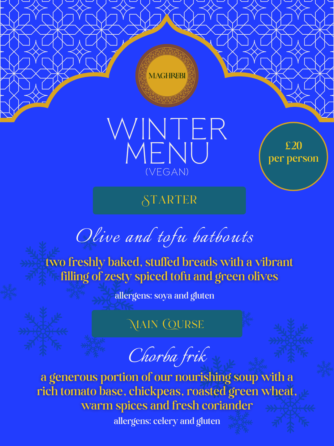 Our delivery menu changes with the seasons, so that you get to try something special each time you order from us! This also allows us to use the best seasonal and local produce.At the moment, we are running our Winter Menu:- Two olive and tofu batbouts (stuffed Moroccan bread)